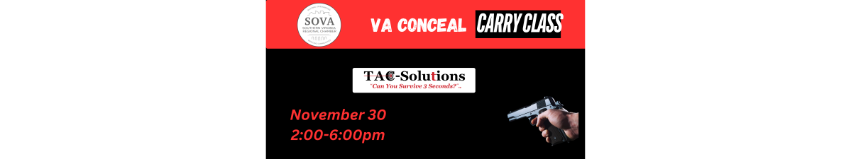 The SOVA Chamber of Commerce is proud to partner with TAC Solutions to bring a 4Hr Concealed Carry Permit Course to our community! This course provides valuable safety education and training for anyone interested in obtaining their permit. We’re excited to help provide resources that support safety, responsibility, and community growth.